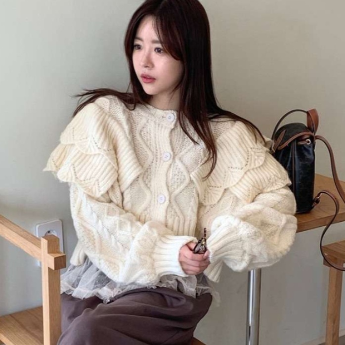 ふんわりとしたラッフル装飾が魅力的なチュニックカーディガンは、冬ライブ参戦服の防寒対策に欠かせません。