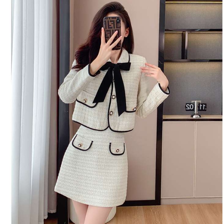 上品なツイード調素材とリボンの組み合わせが美しいセットアップは、冬ライブ参戦服として高級感を演出します。
