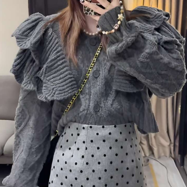 襟には控えめな大きさのフリルが付いており、甘さと上品さが両立したアイテムです。
