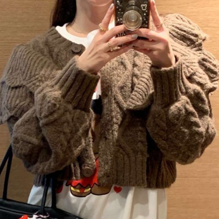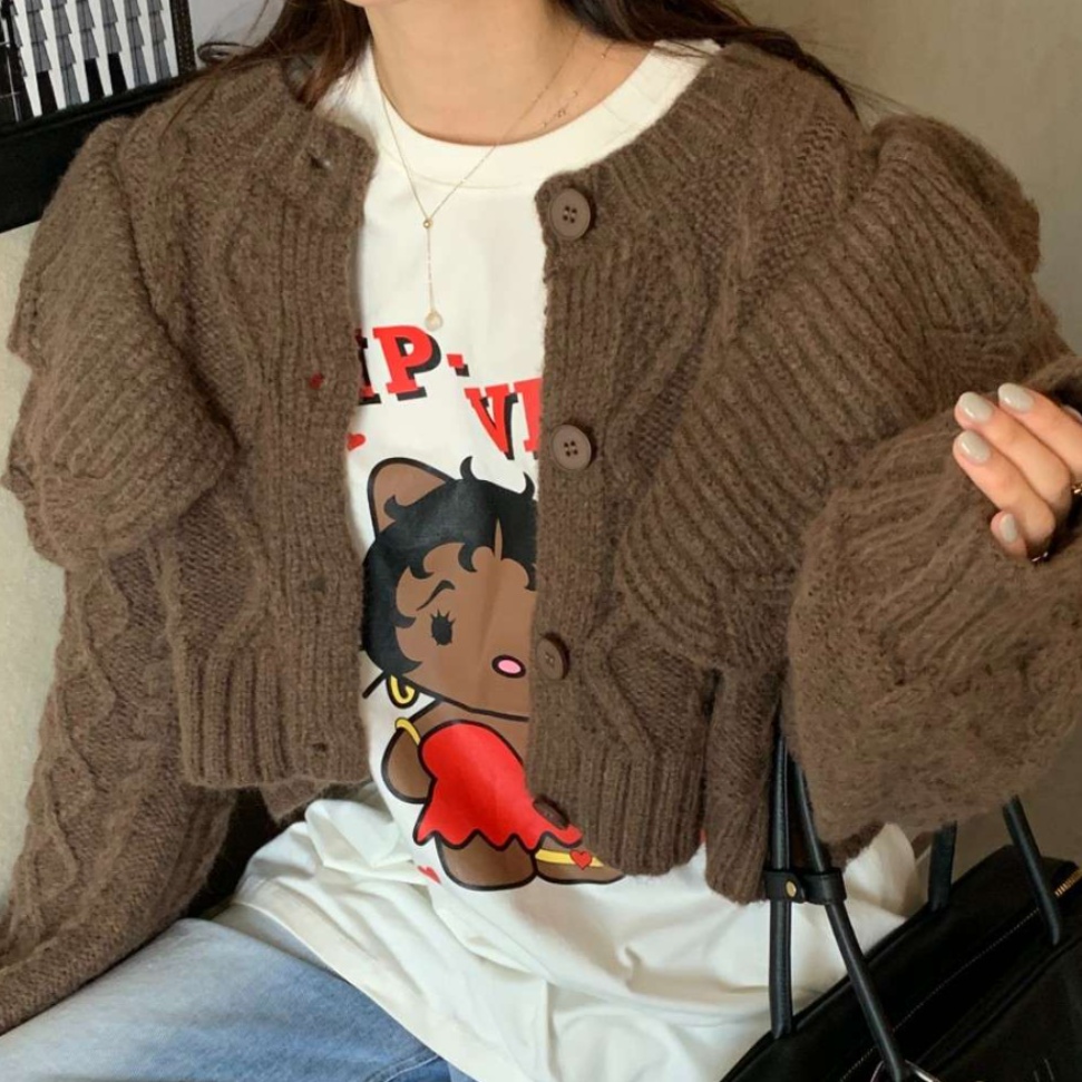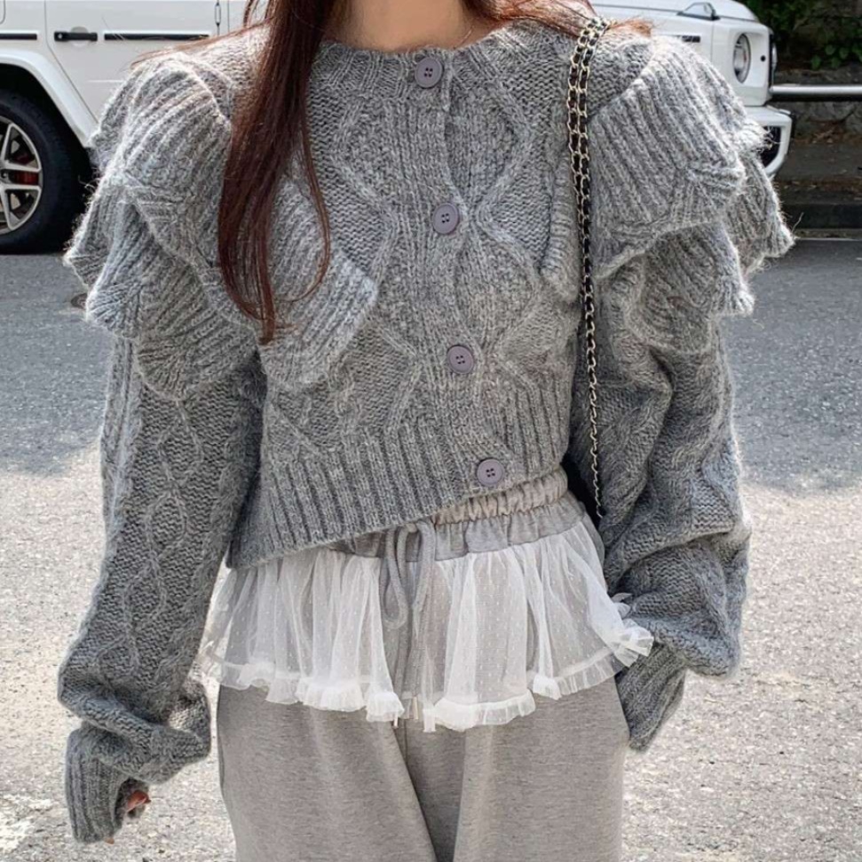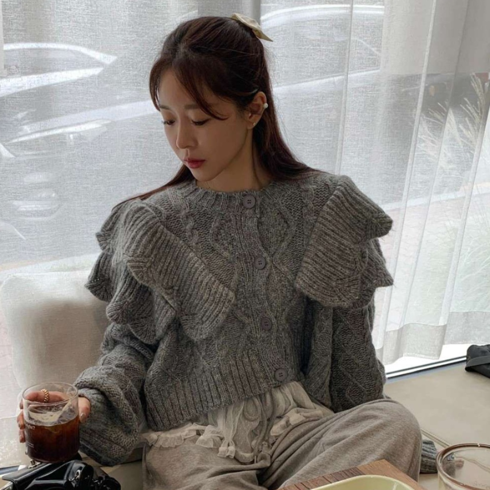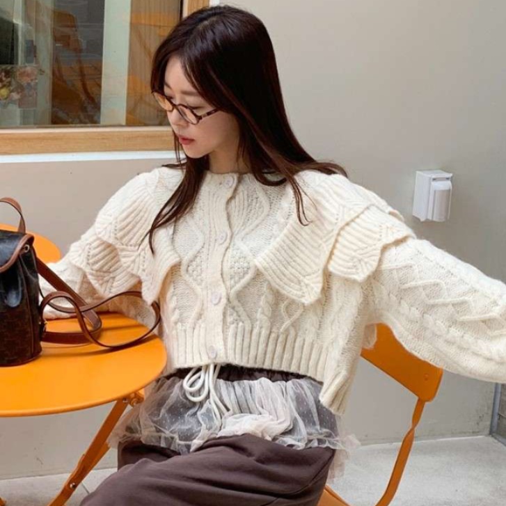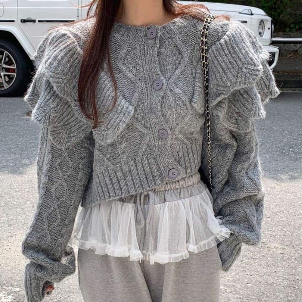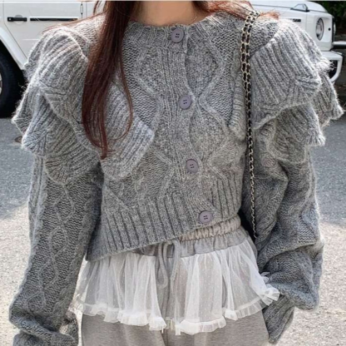たっぷりとしたケーブル編みと裾のチュールフリルがガーリーな雰囲気を演出するカーディガン。ボリューミーな袖とショート丈のバランスが絶妙で、スカートにもパンツにも合わせやすい一着。