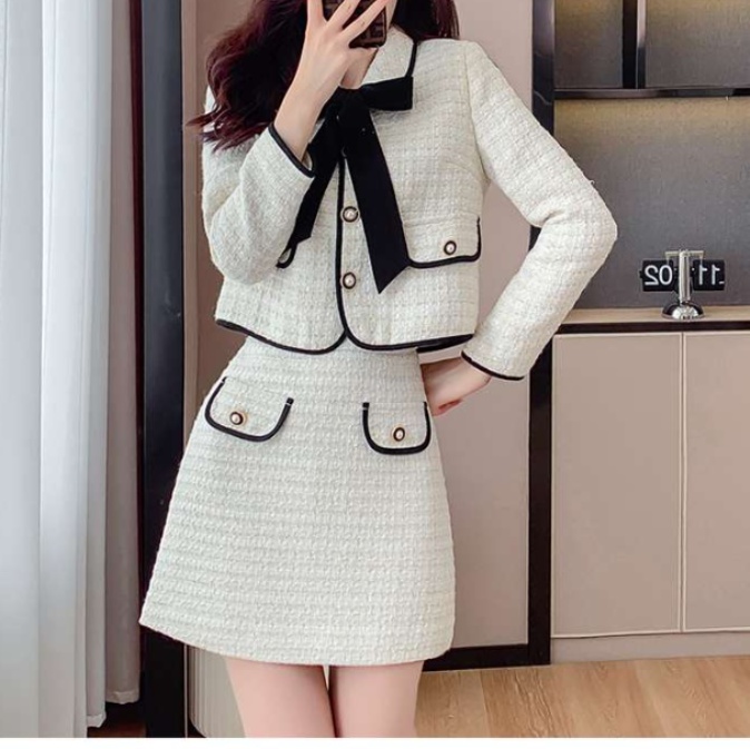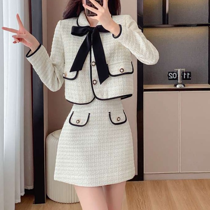 上品な雰囲気漂う女性らしい印象のセットアップ。襟元の大きなリボンと縁取りがアクセント。ジャケットとスカートのシルエットが絶妙なバランスで、着回しやすいデザイン。